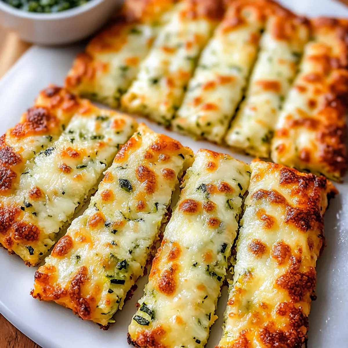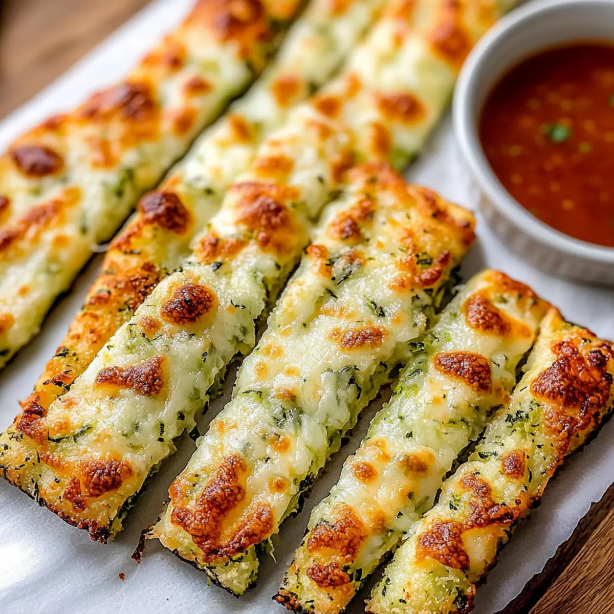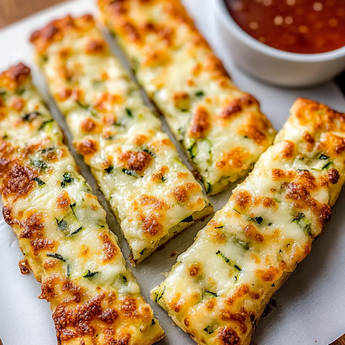 Once the cheese has melted, allow your Cheesy Zucchini Breadsticks to cool for about 5 minutes. Carefully slice them into your desired shapes, whether they be strips or squares. Serve warm, garnished with fresh herbs if desired, alongside marinara or ranch for dipping; these delightful snacks are sure to impress!