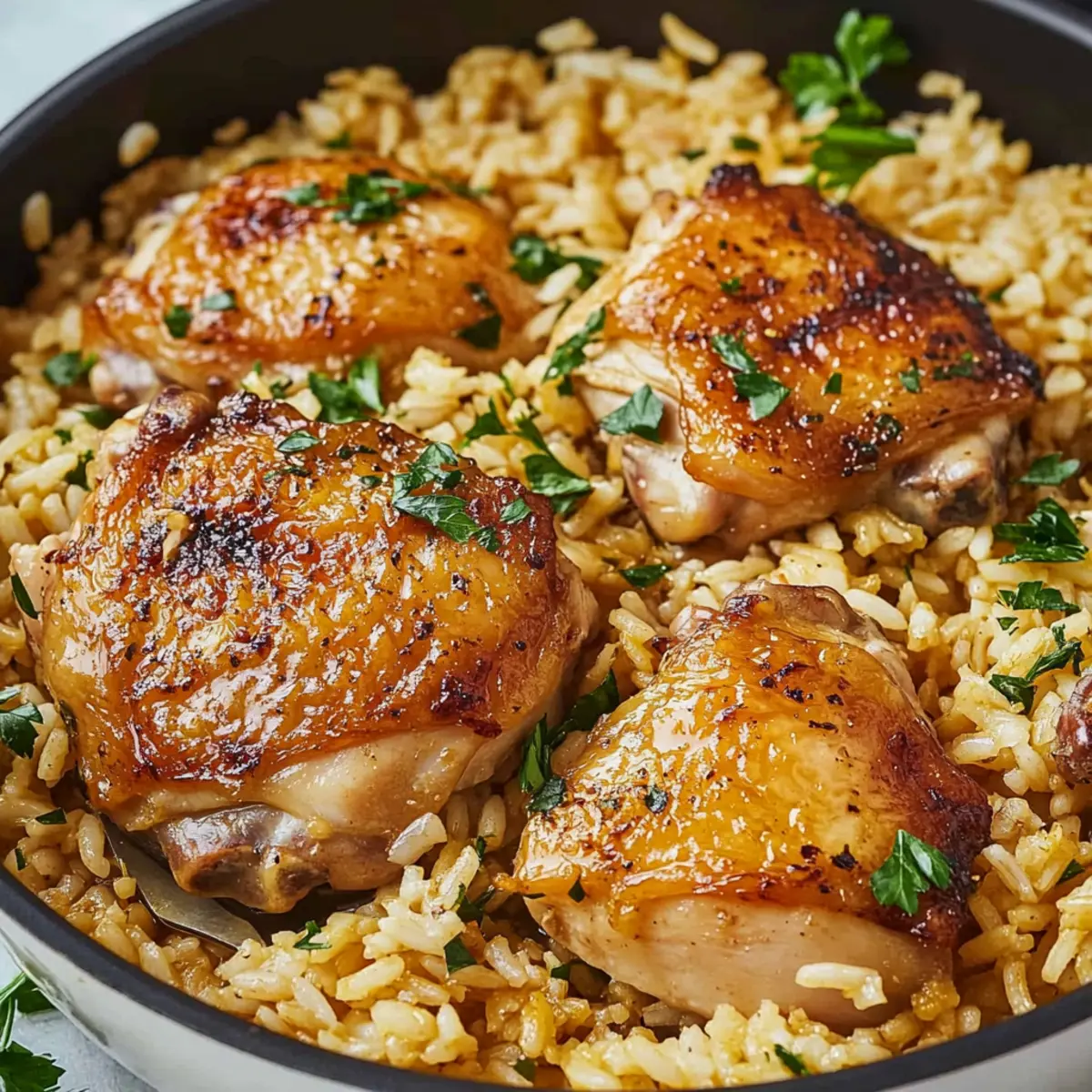After simmering, remove the skillet from heat and let it rest for 5 minutes with the lid on. This resting period allows the flavors to meld beautifully. Before serving, fluff the rice with a fork and garnish your Chicken Thighs and Rice with additional fresh parsley for a burst of color and freshness, making it as pleasing to the eye as it is to the palate.