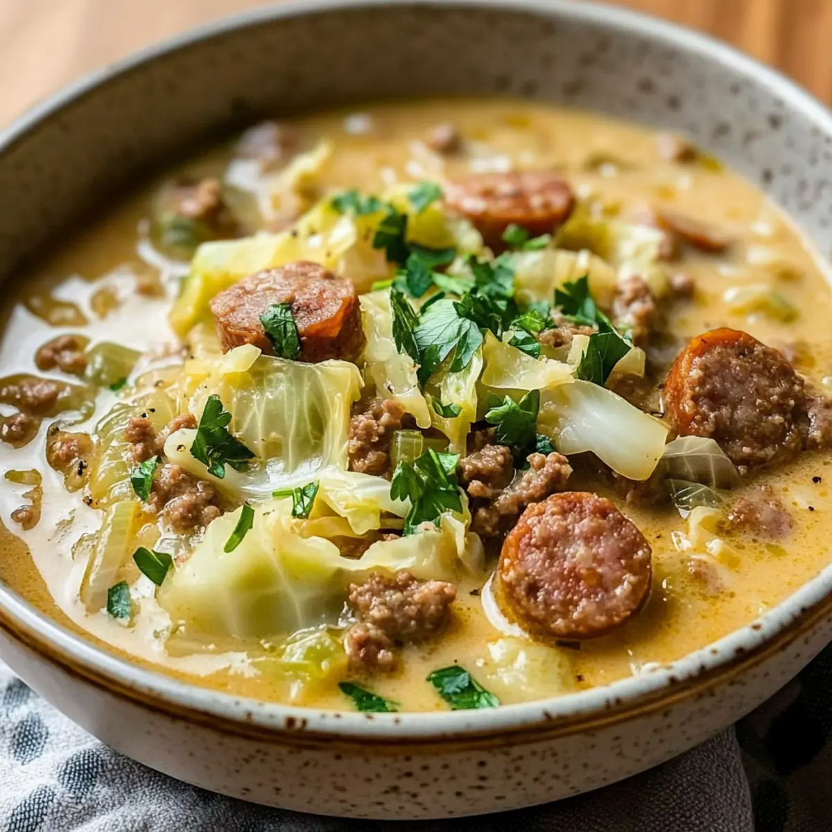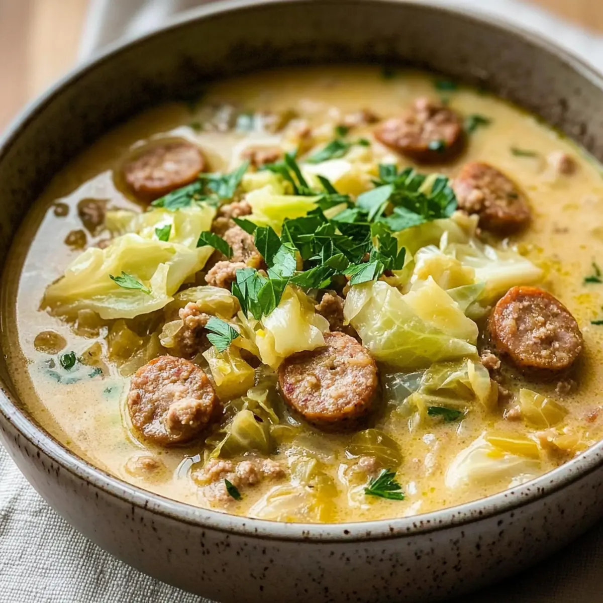 Ladle the soup into bowls, garnishing each with a sprinkle of fresh parsley for a pop of color. For an extra touch of flavor, consider drizzling a little olive oil on top or adding more chili flakes if you enjoy some heat. Your comforting Creamy Sausage & Cabbage Soup is ready to warm your heart!