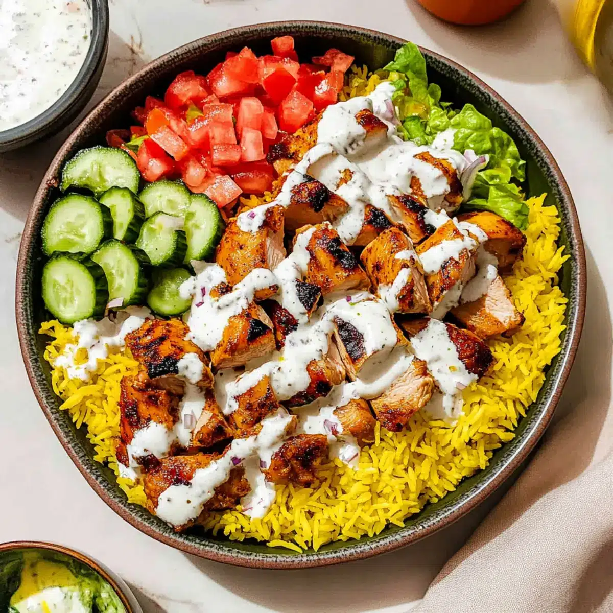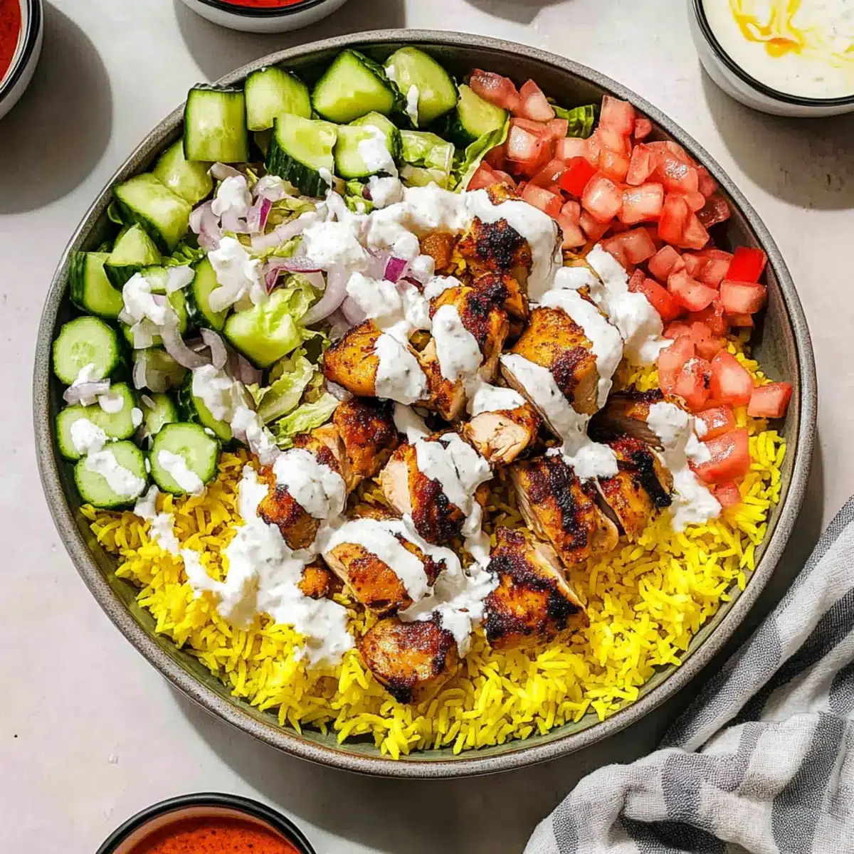 - Assemble the Dish: Serve rice topped with chicken, salad, and a drizzle of white sauce and hot sauce.