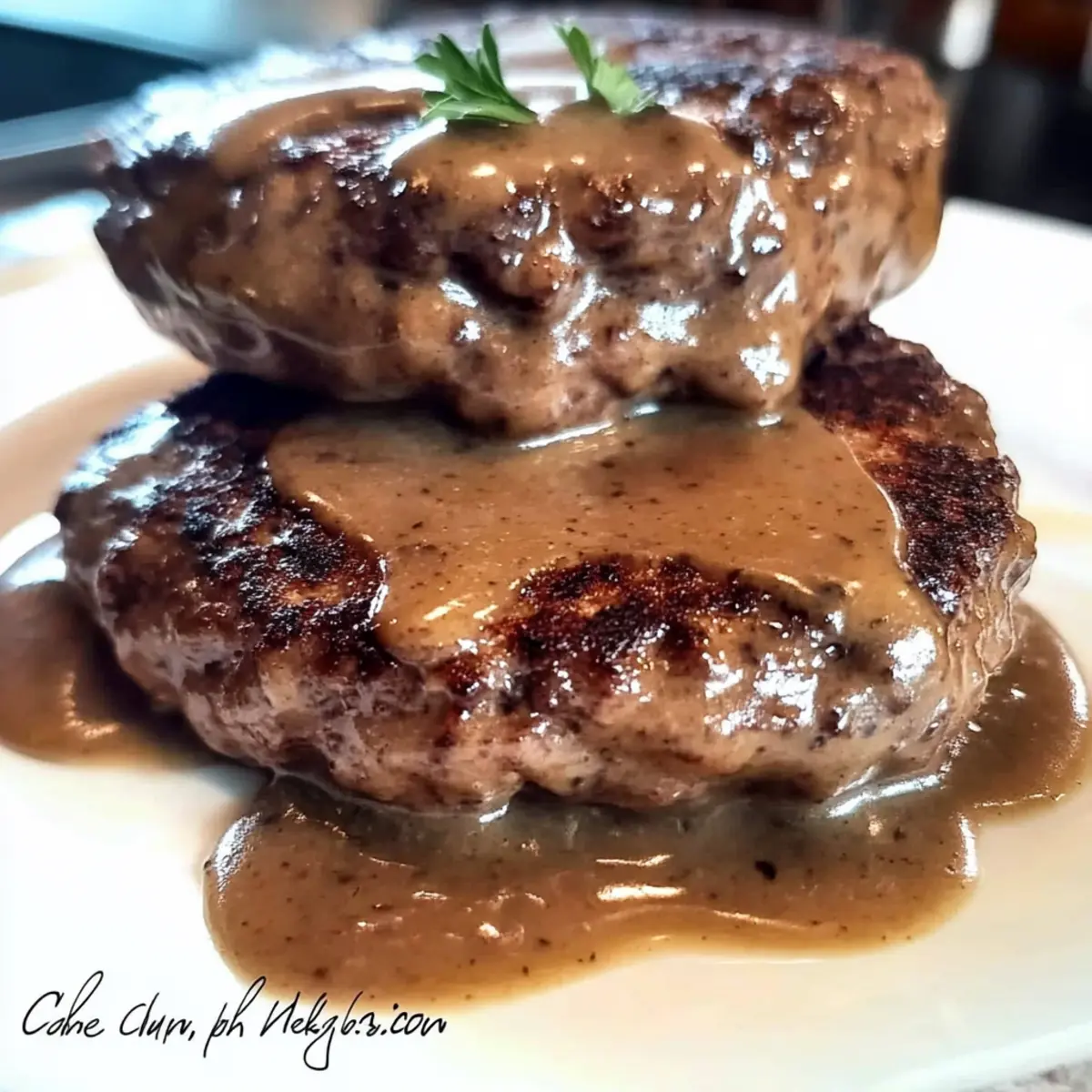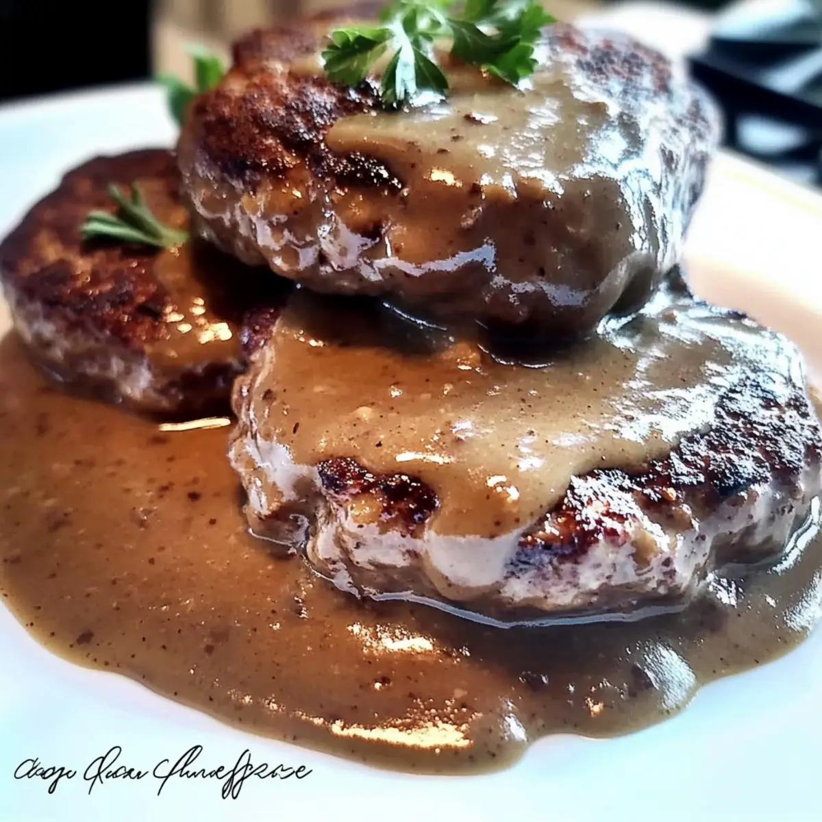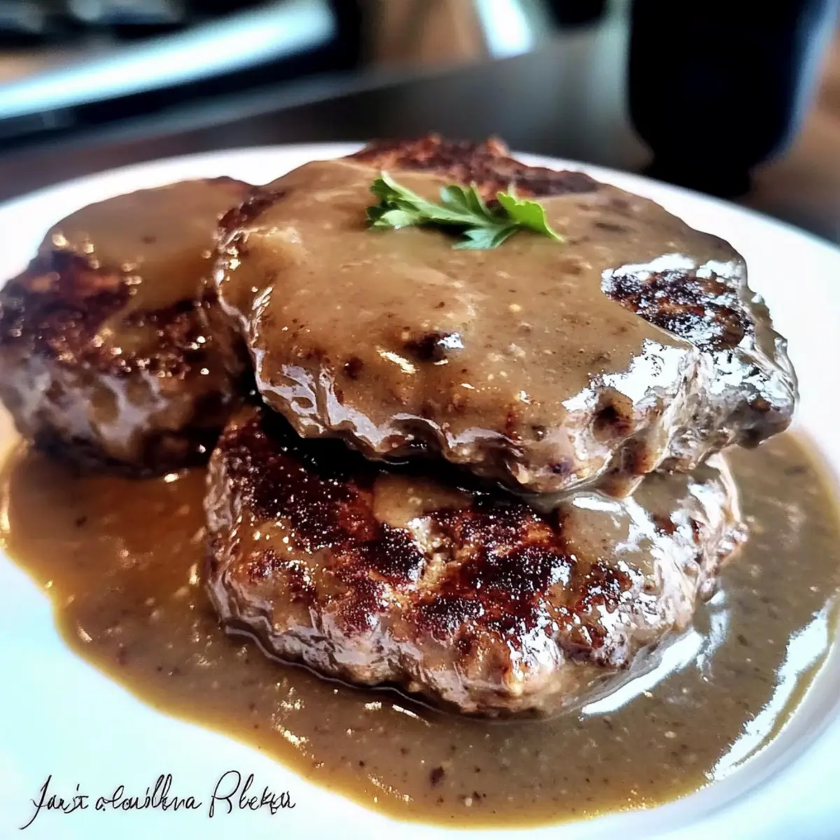 - Return patties to skillet, spoon gravy over them, and simmer for 2-3 minutes before serving.