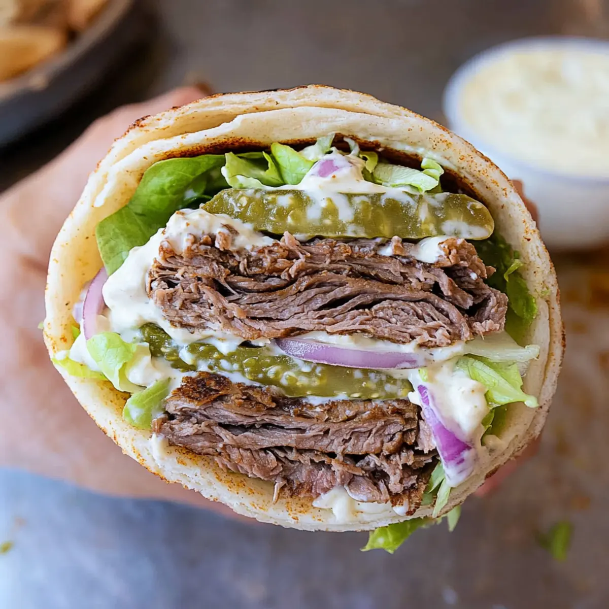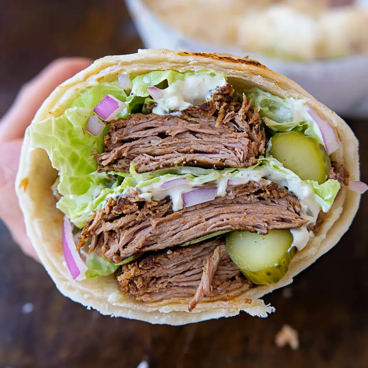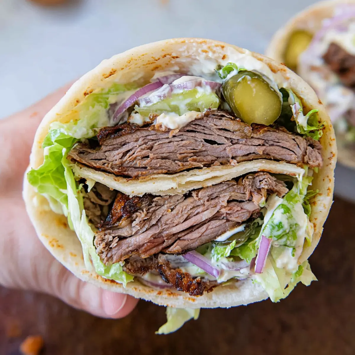 - Warm pita or tortillas, arrange sliced meat on top and add toppings like lettuce, red onion, and pickles. Drizzle with sauces, and serve.