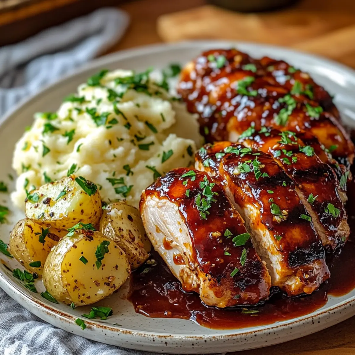Once both the chicken and potatoes are ready, allow the chicken to rest for a few minutes. Arrange the succulent Honey BBQ Chicken on a serving platter alongside the creamy garlic Parmesan potatoes. For a vibrant touch, garnish with fresh parsley, adding a pop of color to your beautiful, comforting meal. Enjoy the delightful harmony of flavors!