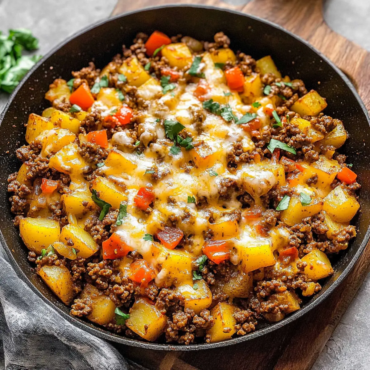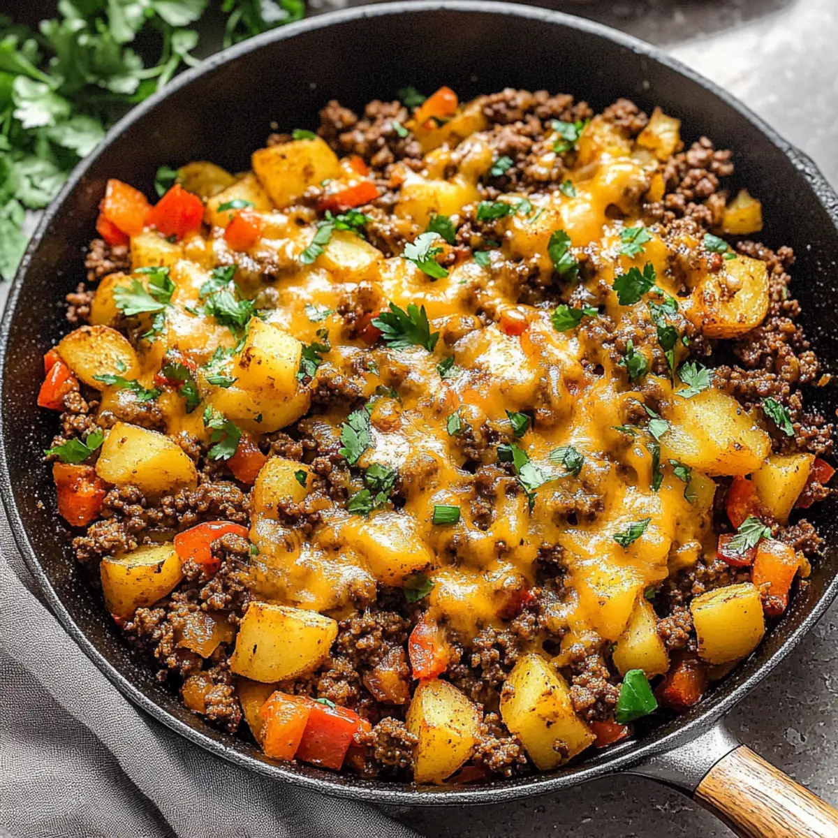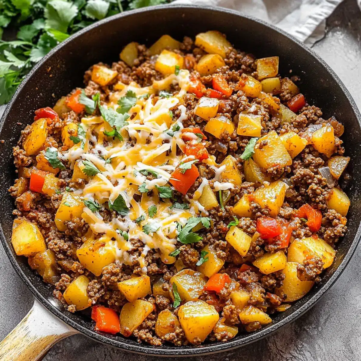 Finally, taste your Mexican Ground Beef and Potato Skillet and adjust the seasoning if necessary. Before serving, sprinkle 1 cup of shredded cheese on top. Cover the skillet and let it cook for about 1 minute on low heat, or until the cheese is melted and bubbly. Garnish with freshly chopped cilantro if desired, and serve hot for a comforting family meal!