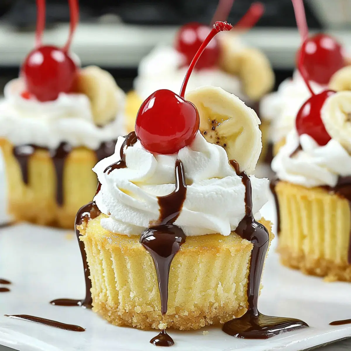 - Top each cheesecake with whipped cream, banana slices, and a maraschino cherry. Drizzle with chocolate sauce before serving.
