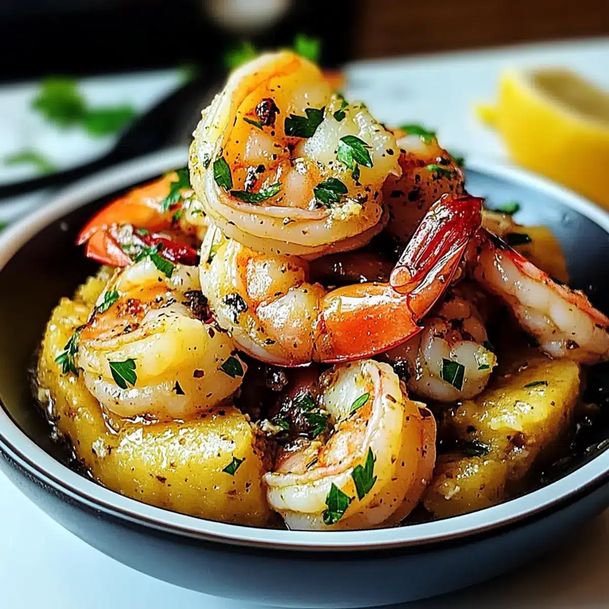 Remove the skillet from heat and stir in freshly squeezed lemon juice and chopped parsley for a burst of flavor and freshness. Ensure all ingredients are well combined, creating a luscious, aromatic sauce that will coat your shrimp and complement the mofongo perfectly.