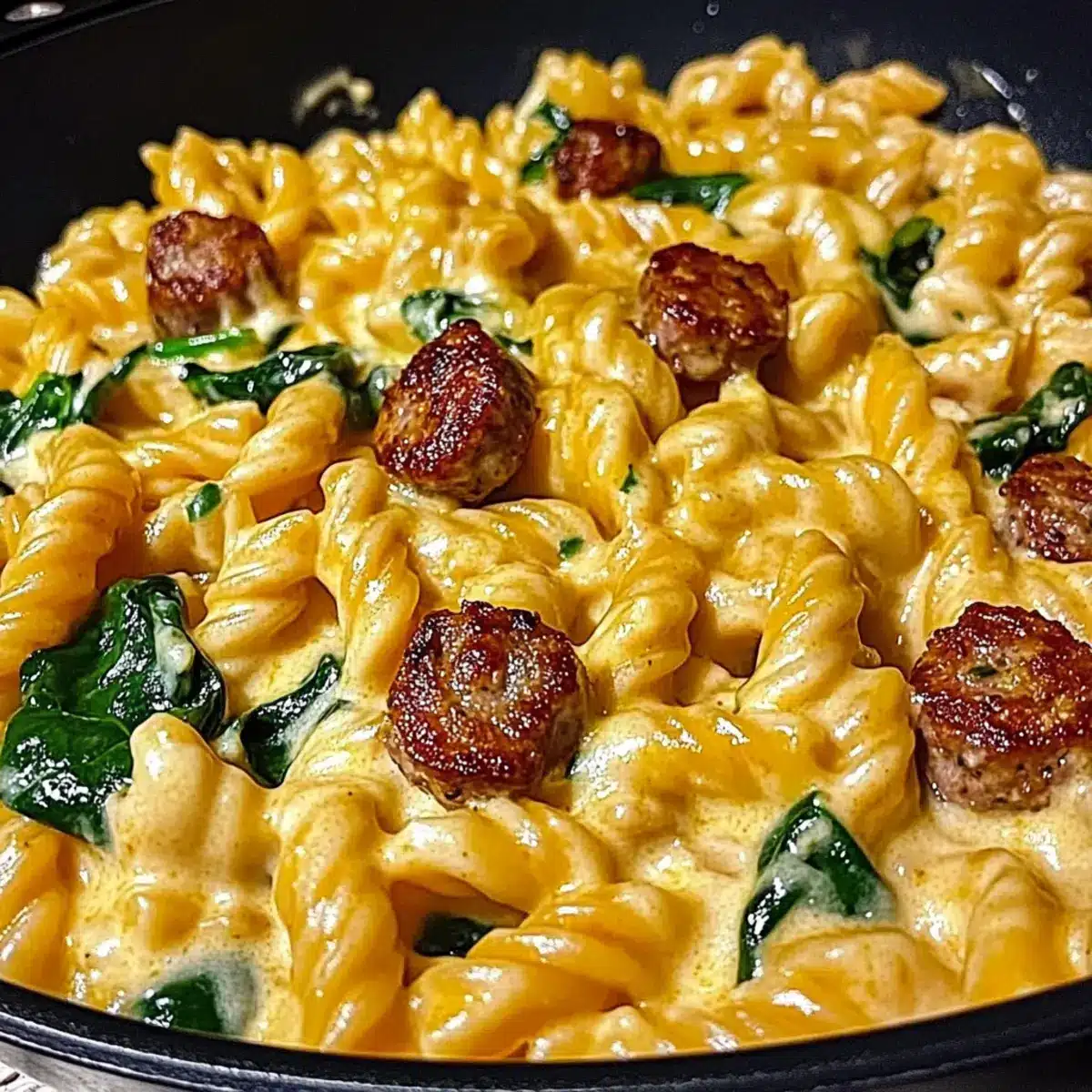 Now it’s time to brighten up your dish! Gently fold in 2 cups of fresh spinach and 1 cup of roasted red peppers, allowing the residual heat to wilt the spinach. Return the browned sausage to the pan, mixing everything evenly. The vibrant colors and tantalizing flavors will make this a comforting meal.