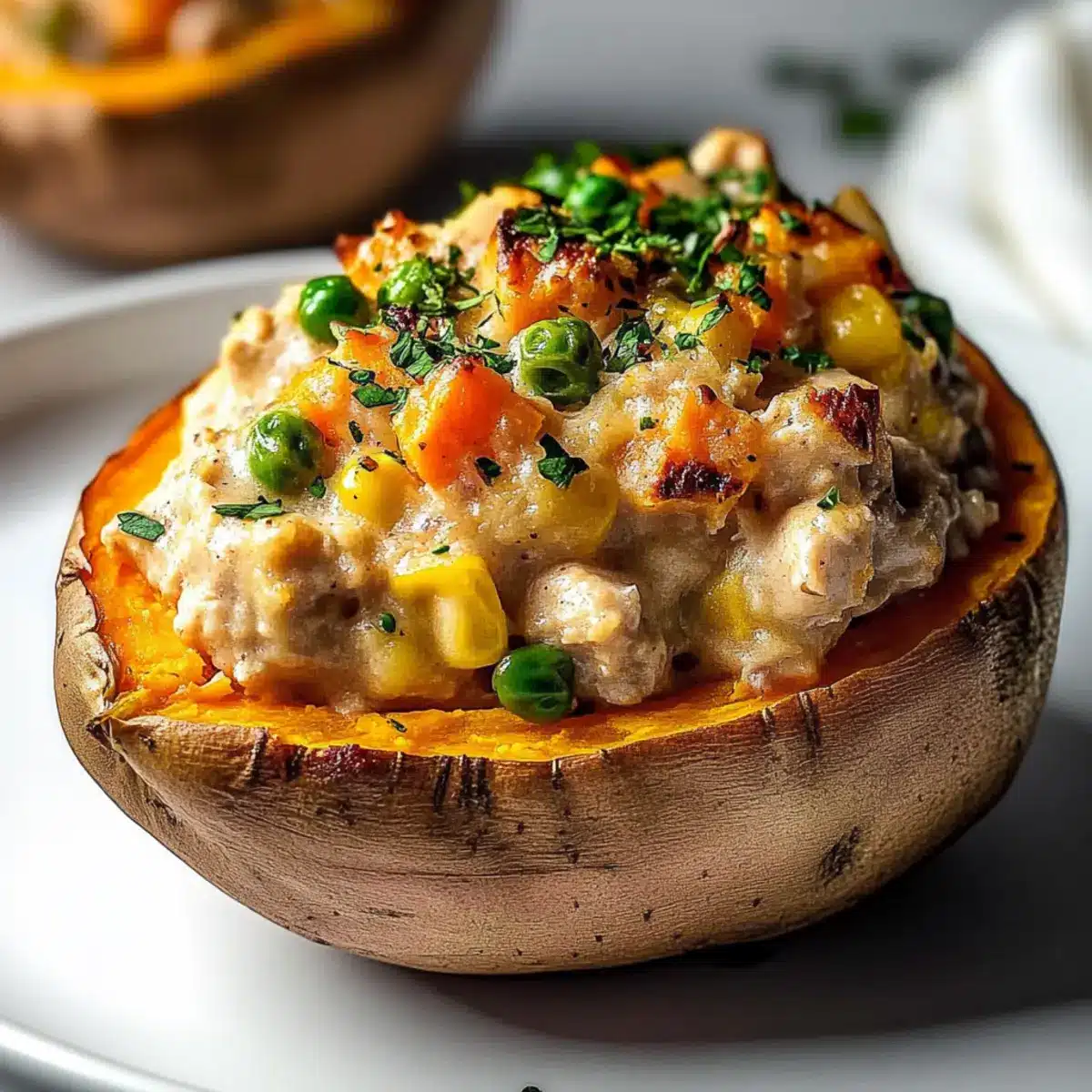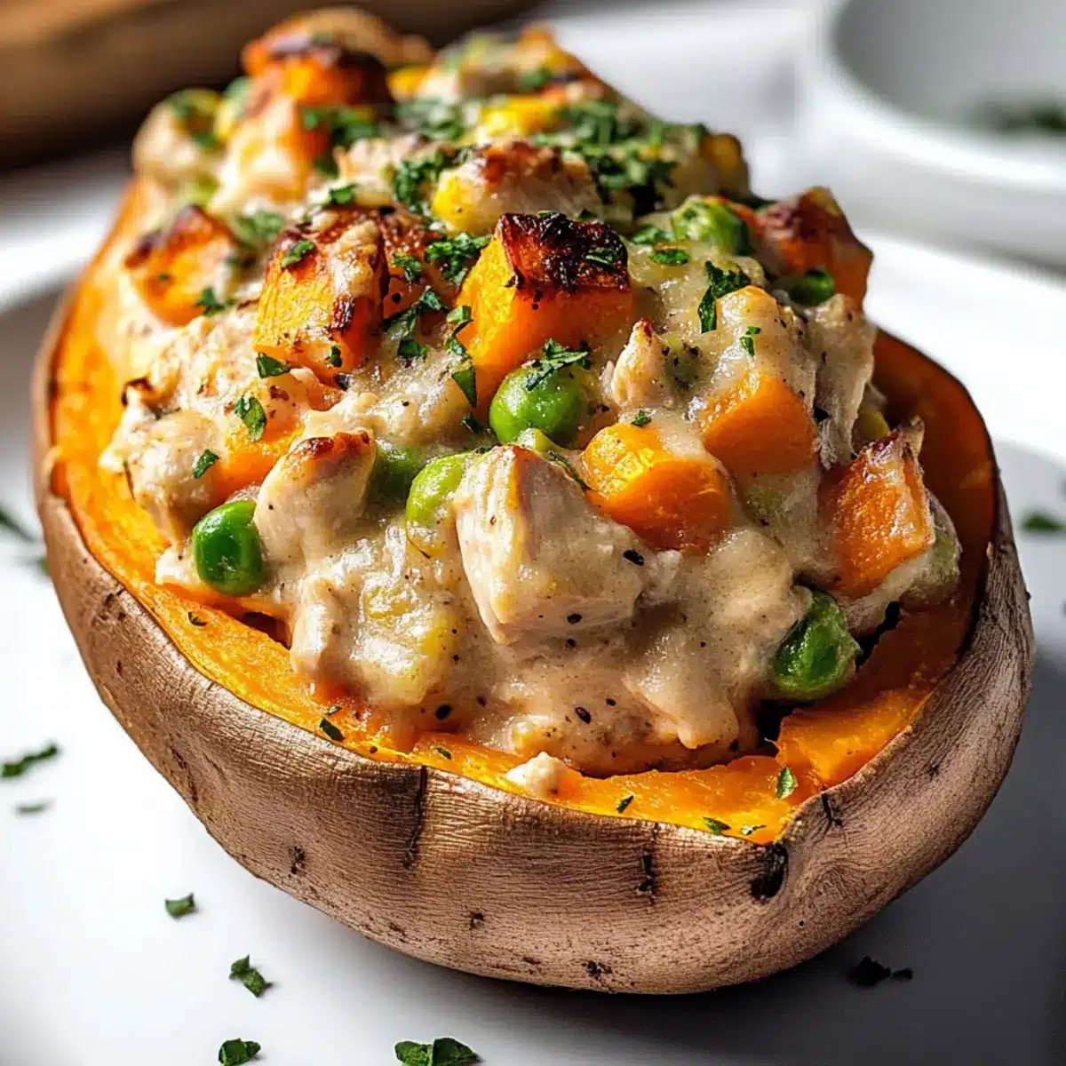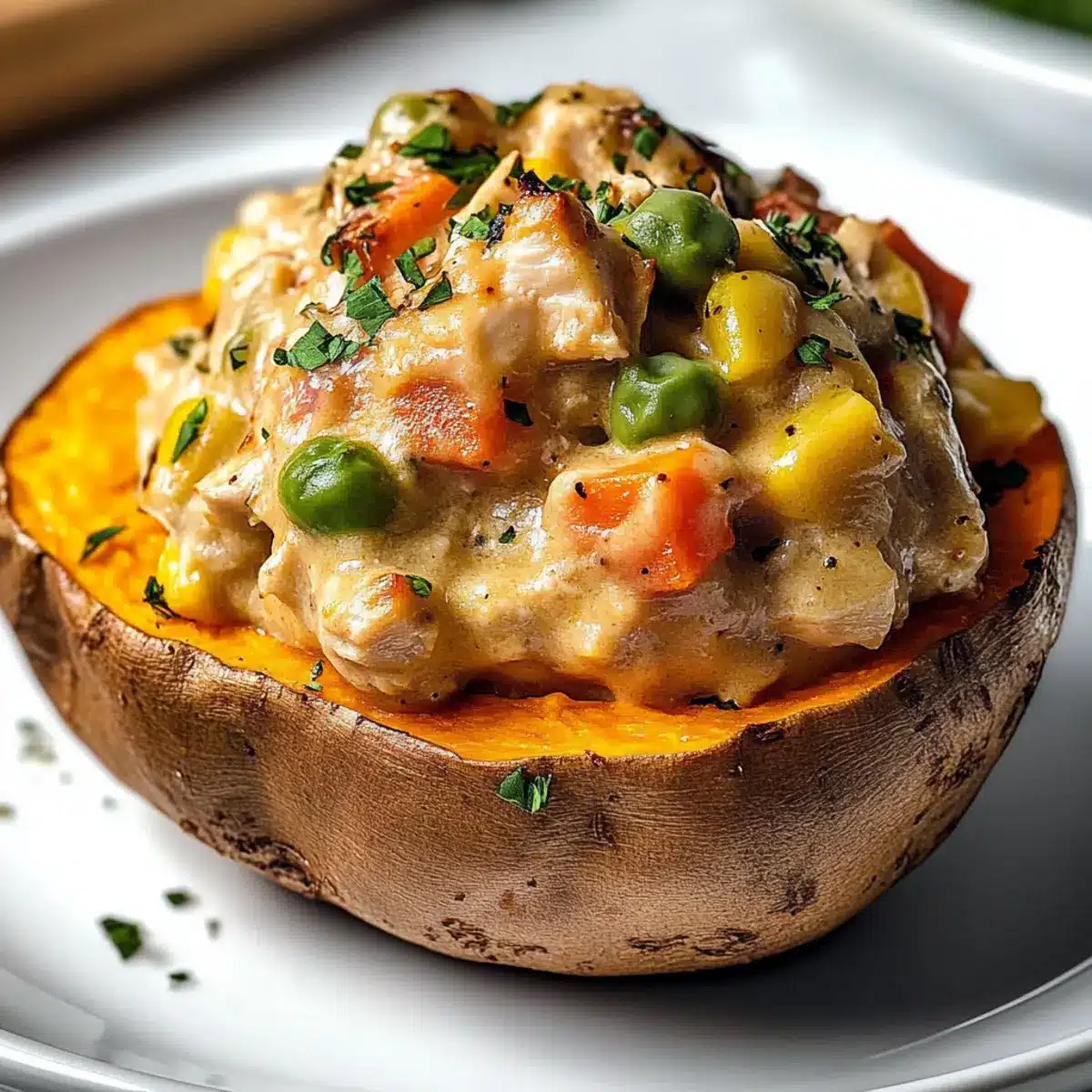 Nutritious Comfort: These Chicken Pot Pie Stuffed Sweet Potatoes bring together creamy chicken and nutrient-rich sweet potatoes for a healthy dinner option.