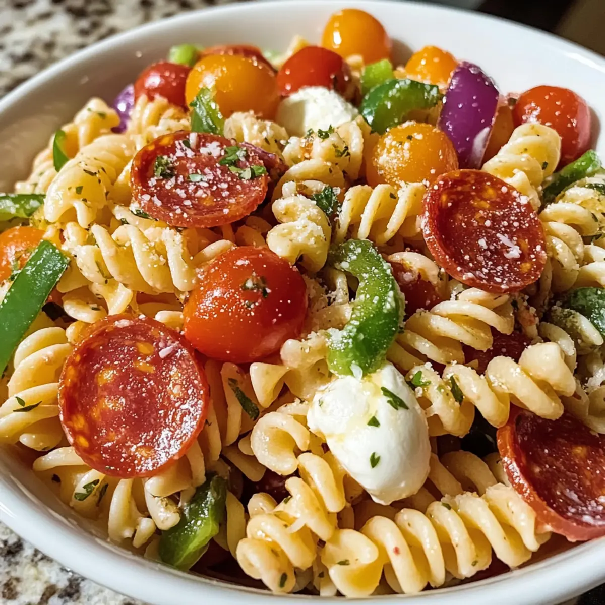 - In a mixing bowl, combine the cooled pasta with pepperoni, mozzarella, cherry tomatoes, black olives, green bell pepper, and red onion. Toss gently to distribute.