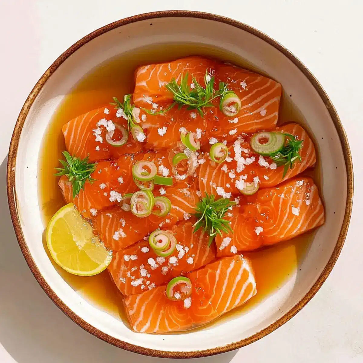 Next, gently pour the citrus soy dressing around the salmon pieces without letting it come into direct contact with the fish just yet. This careful technique will prevent the citrus from ‘cooking’ the salmon while allowing the flavors to meld beautifully. You’ll see the dressing beautifully pool around the salmon.