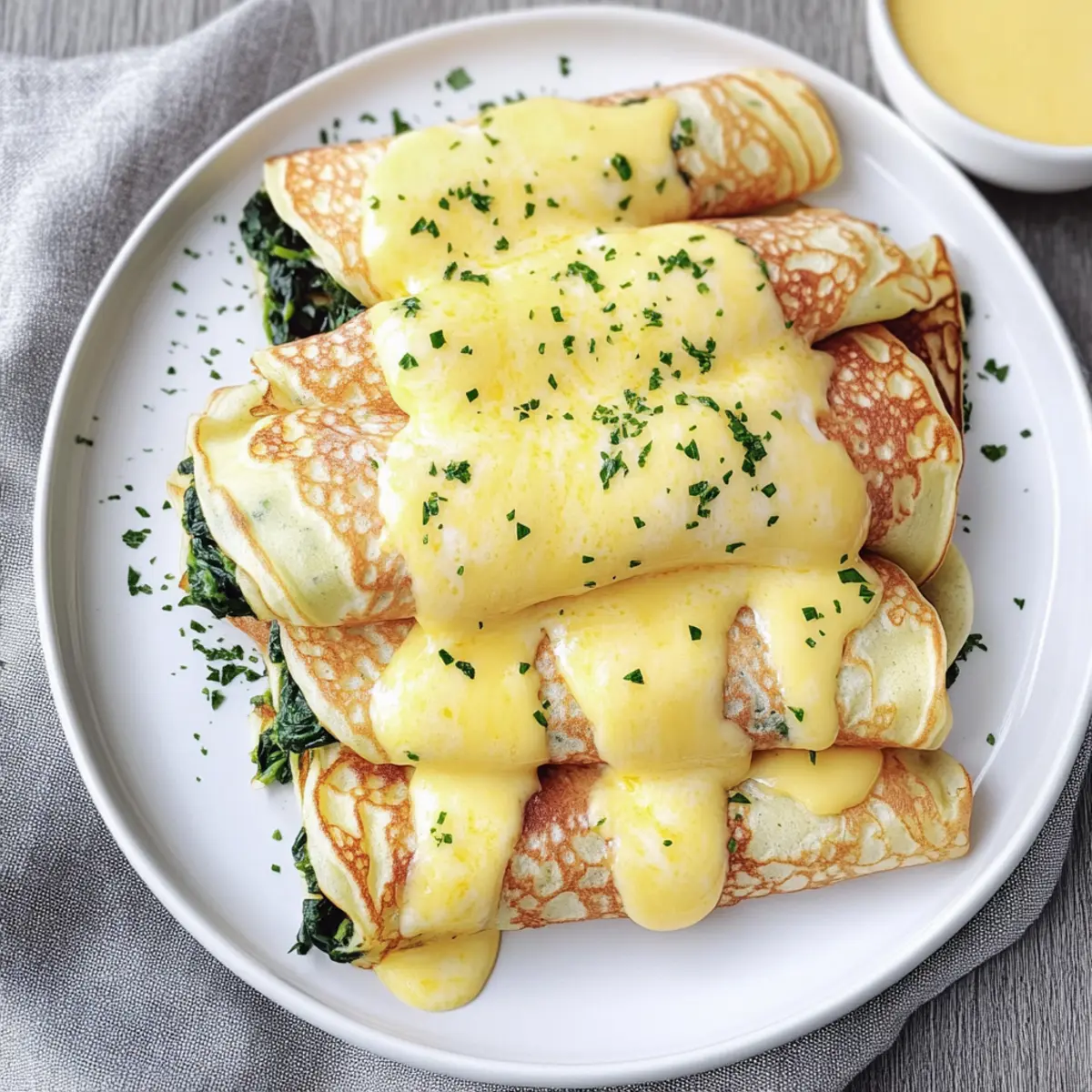 Take a warm crepe and lay it flat on a plate. Place a generous scoop of sautéed spinach, some fluffy scrambled eggs, and a handful of shredded cheddar cheese in the center. Fold the sides of the crepe over the filling, creating a neat envelope. Repeat this process for each crepe, making sure to keep them warm.