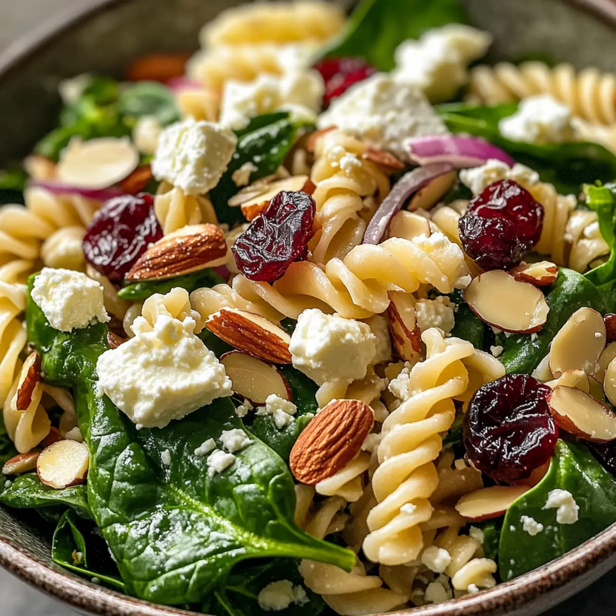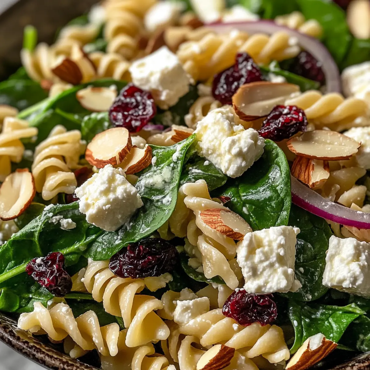 - In a large mixing bowl, combine the cooled pasta, spinach, feta, cranberries, sliced almonds, and red onion. Toss gently to mix.